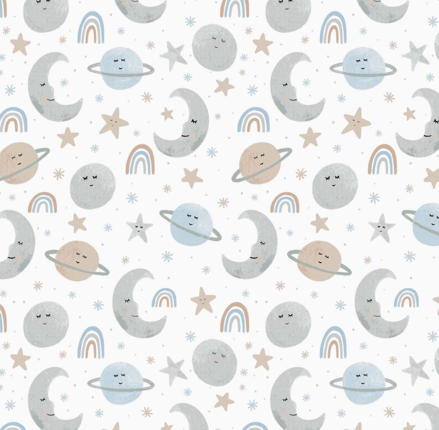 Nursery Cotton Fabric by the Yard - Twinkle Twinkle Little Star Love You to the Moon Light Blue: white background with pastel stars, moons, planets, and rainbows